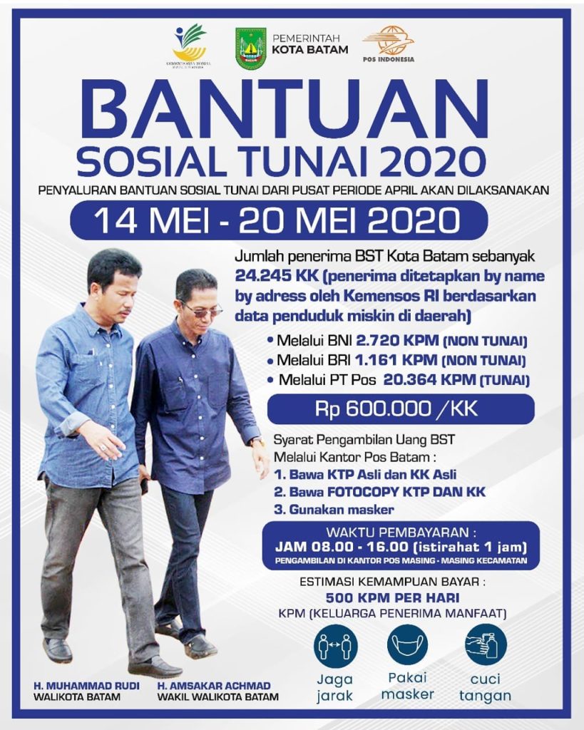 Jadwalnya yaitu Kelurahan Sagulung Kota 16 Mei, Sei Langkai dan Sei Pelunggut 18-19 Mei, serta Sei Lekop 19-20 Mei. Sementara Kelurahan Tembesi akan dibagikan di Kantor Pos Batuaji pada 18-19 Mei.Kantor Pos Batuaji juga melayani pembagian BST untuk warga kecamatan tersebut.