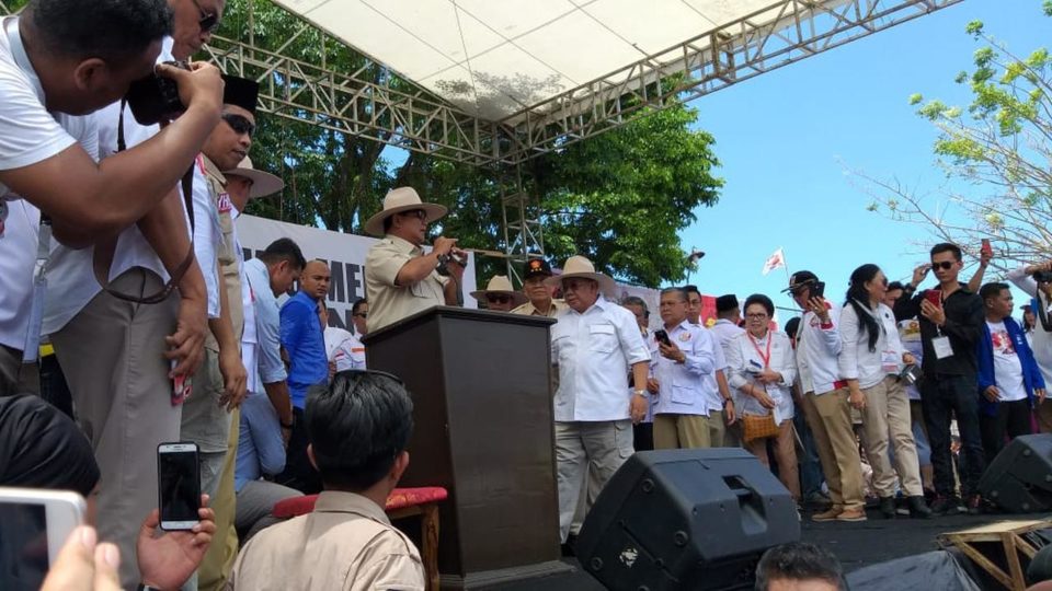 Kampanye terbuka Prabowo di Manado dijadwalkan pukul 10.00 Wita. Sejak pagi hari, para pendukungnya sudah membanjiri Lapangan Ketangbaru Manado. Namun Prabowo baru muncul di lokasi sekitar pukul 11.30 Wita. Dia hadir dengan disambut yel-yel kemenangan dari para pendukungnya.