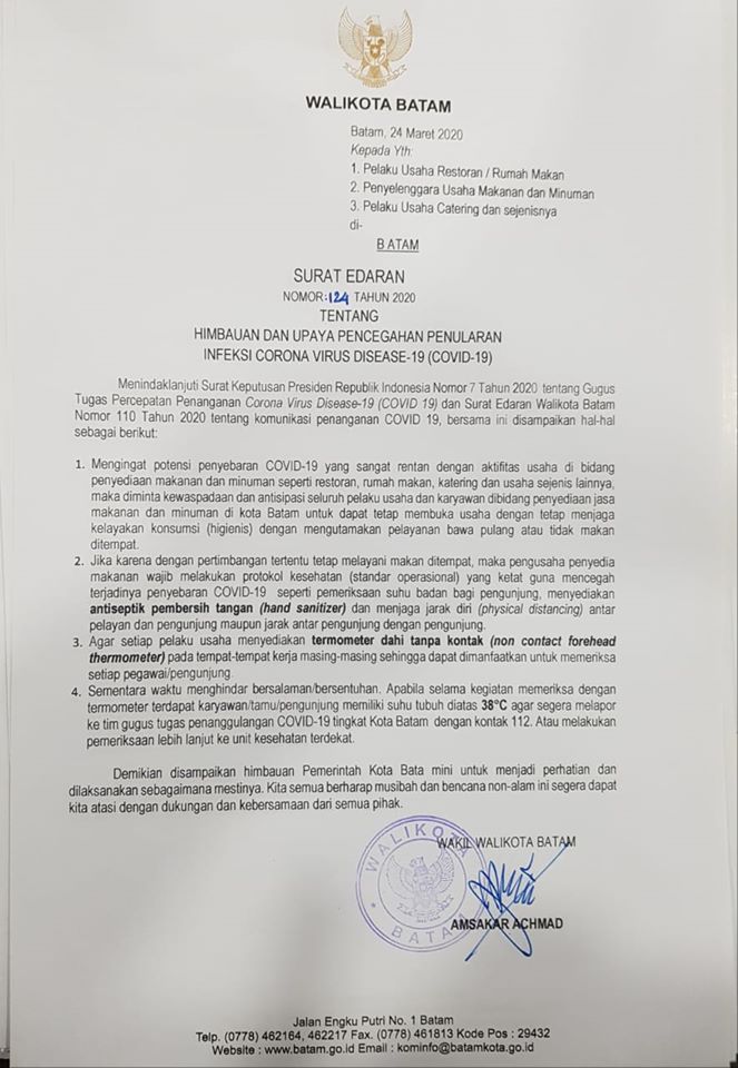 Poin pertama surat ini berbunyi “Mengingat potensi penyebaran COVID-19 yang sangat rentan dengan aktifitas usaha di bidang penyediaan makanan dan minuman seperti restoran, rumah makan, katering, dan usaha sejenis lainnya, maka diminta kewaspadaan dan antisipasi seluruh pelaku usaha dan karyawan di bidang penyediaan jasa makanan dan minuman di Kota Batam untuk dapat tetap membuka usaha dengan selalu menjaga kelayakan konsumsi (higienis) dan mengutamakan pelayanan bawa pulang atau tidak makan di tempat”.