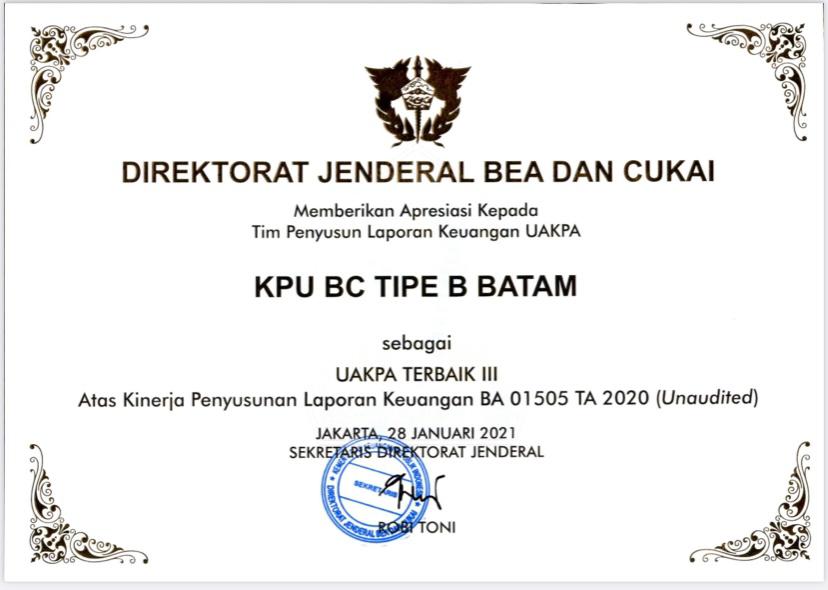 Batam | Berita Terbaru | Berita Utama | KEPULAUAN RIAU | • 6 Maret 2021 • BC Batam Raih Peringkat 3 Atas Kinerja Penyusunan Laporan Keuangan Tingkat DJBC Se-Indonesia PROBATAM.CO, Batam – Bea Cukai Batam kembali torehkan prestasi, kali ini berhasil menjadi Unit Akuntansi...