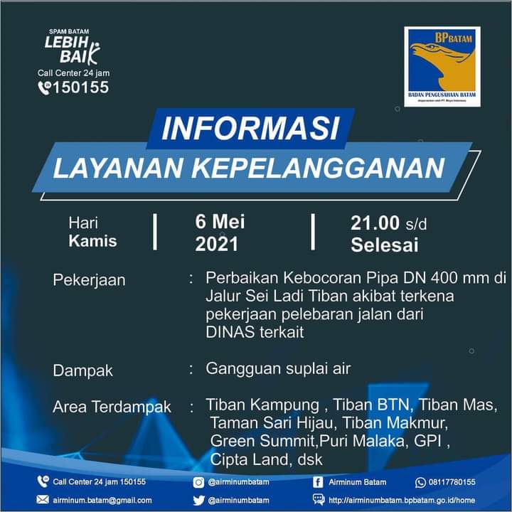 “Informasi lebih lanjut dapat menghubungi saluran resmi informasi kepelangganan melalui Call Center SPAM Batam 24 jam dan Media Sosial Resmi Perusahaan dengan menyebutkan identitas pelanggan secara lengkap,” ungkapnya (*/iin).