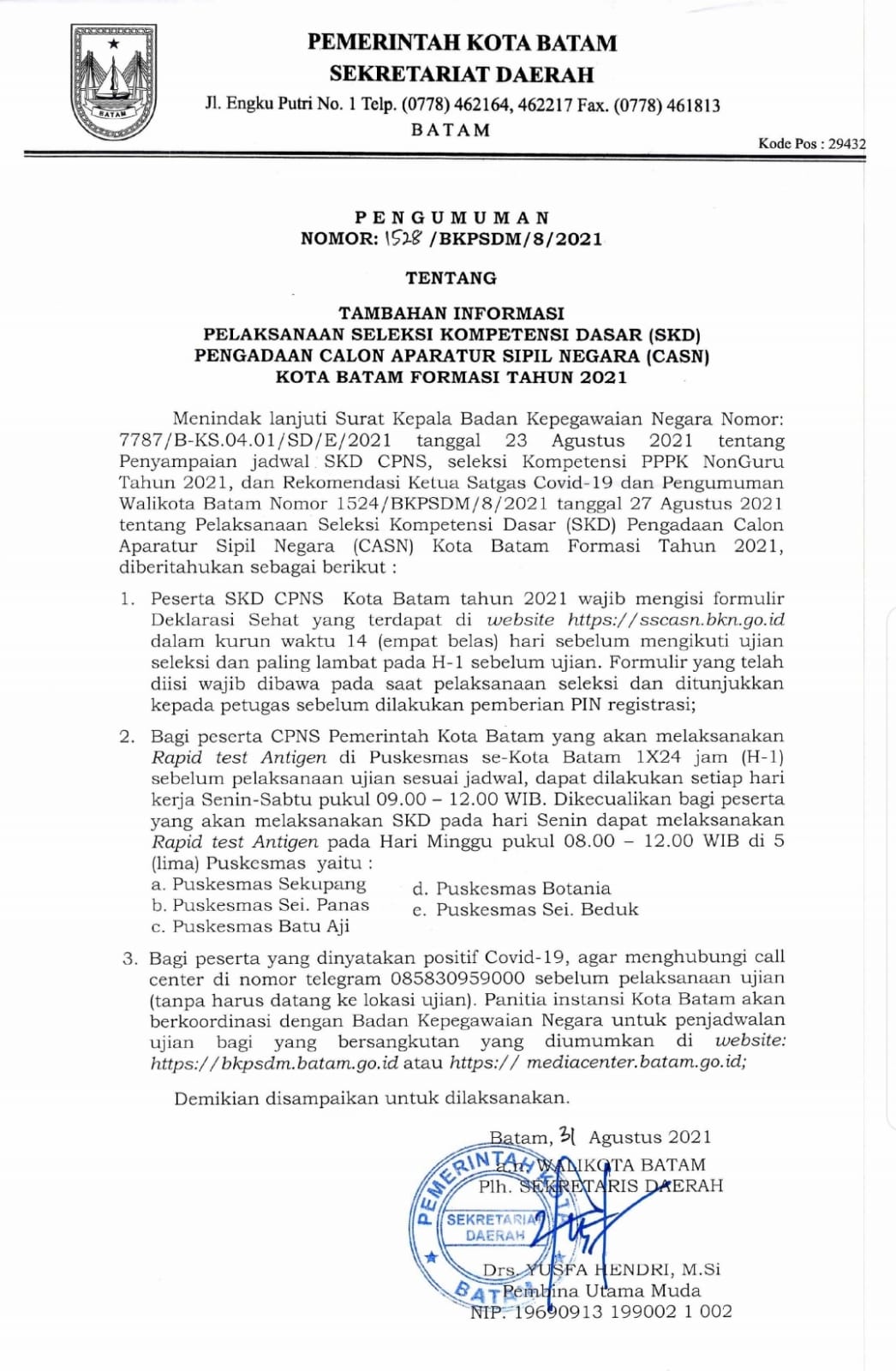 Batam | Berita Terbaru | Berita Utama | KEPULAUAN RIAU | • 1 September 2021 • Pengumuman Tambahan Informasi Pelaksanaan SKD Pengadaan CASN Kota Batam Formasi 2021 PROBATAM.CO, Batam– Menindak lanjuti Surat Kepala Badan Kepegawaian Negara Nomor 7787/ B-KS.04.01/SD/E/2021 tanggal 23 Agustus...