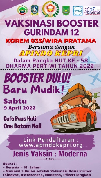 Batam | Berita Terbaru | Berita Utama | • 8 April 2022 • Jelang Arus Mudik, Korem 033/WP dan Apindo Gandeng SMSI Gelar Vaksin Booster di One Batam Mall PROBATAM.CO, Batam- Saat ini banyak warga yang berencana untuk mudik atau pulang kampung jelang lebaran...
