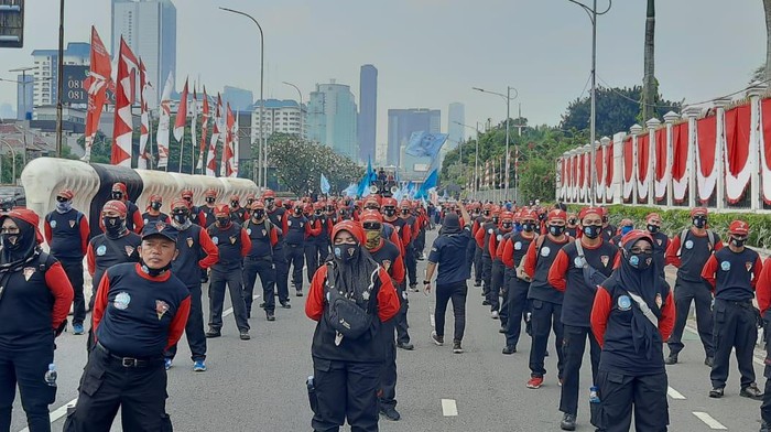 Pantauan detikcom, long march dilakukan di sepanjang Jalan Gatot Subroto, Rabu (10/8/2022) sekitar pukul 11.00 WIB. Ribuan buruh mulai bergerak menuju ke gedung DPR.