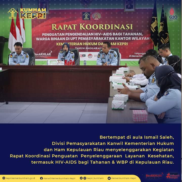 Berita Terbaru | Berita Utama | Tanjung Pinang | • 23 November 2022 • DIVPAS Kanwil Kemenkumham Kepri Rakor Penguatan Yankes, Termasuk HIV- AIDS Bagi Tahanan dan Napi PROBATAM.CO, Tanjungpinang,- ( Senin / 21 november 2022 ) Bertempat di aula Ismail Saleh, Divisi...