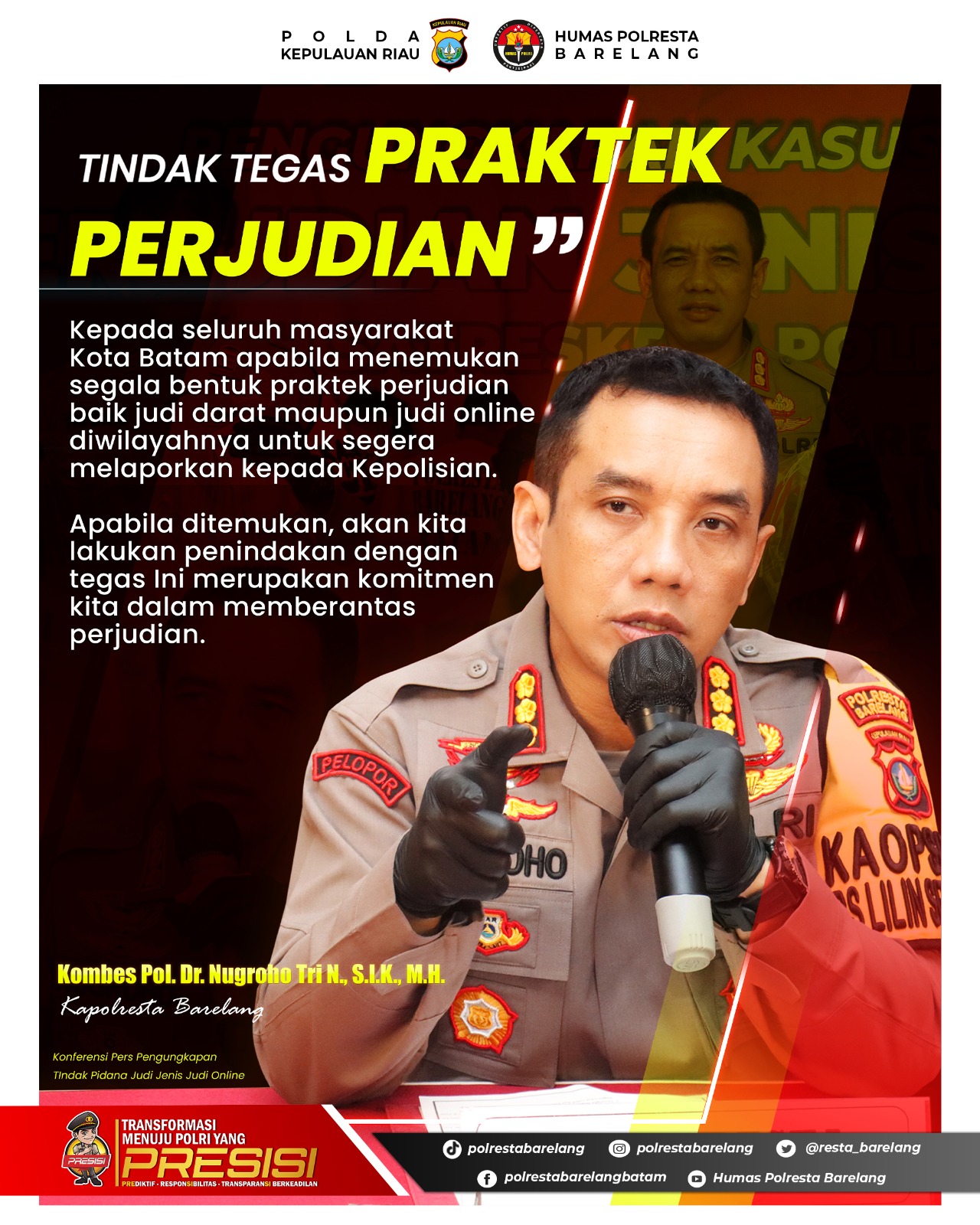 Batam | Berita Terbaru | Berita Utama | • 21 Maret 2024 • Kapolresta Barelang Ungkap Kasus Perjudian Jenis Judi Online yang Servernya berada di Negara Kamboja PROBATAM.CO, Batam – Kapolresta Barelang Kombes Pol Dr. Nugroho Tri N, SIK, MH gelar pengungkapan...