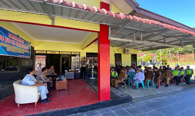 PROBATAM.CO, Anambas – Petugas Jasa Raharja Samsat Anambas, Afwan Fatoni bersama Satlantas Polres Anambas melakukan sosialisasi UU No 22 Tahun 2009 Tentang Lalu Lintas dan Angkutan Jalan sejalan dengan rangkaian acara Peresmian Unit Lantas Polsek Palmatak Polres Anambas, Senin (06/05/2024).