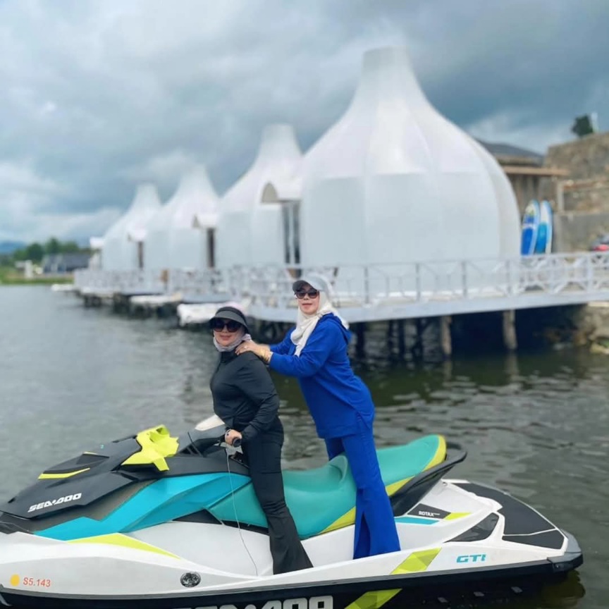 Ketua IWMR Kota Pekanbaru, Sri Nofrita, SH, MH dan ibu-ibu IWMR juga menyempatkan berjetsky di Danau Diatas, Alahan Panjang, Minggu (16/2/2025). Foto : dok/iwmr