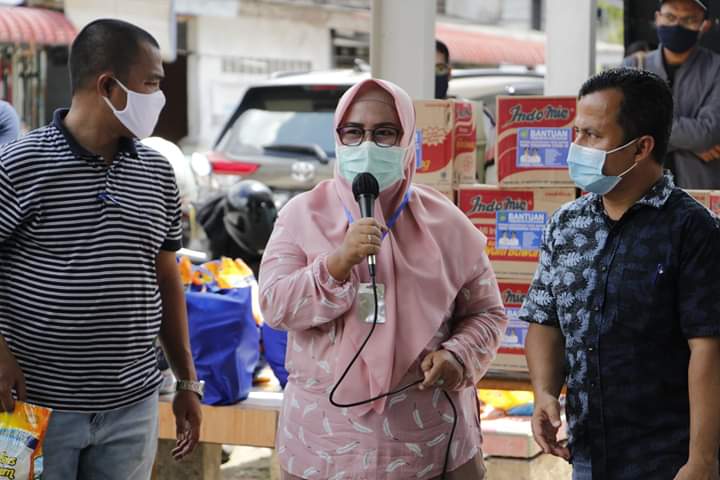 Camat Lubuk Baja Novi Hasmadyastuti saat penyerahan sembako tahap II dari Pemko Batam, Jumat (15/5/2020). (Photo:dok/petugas)