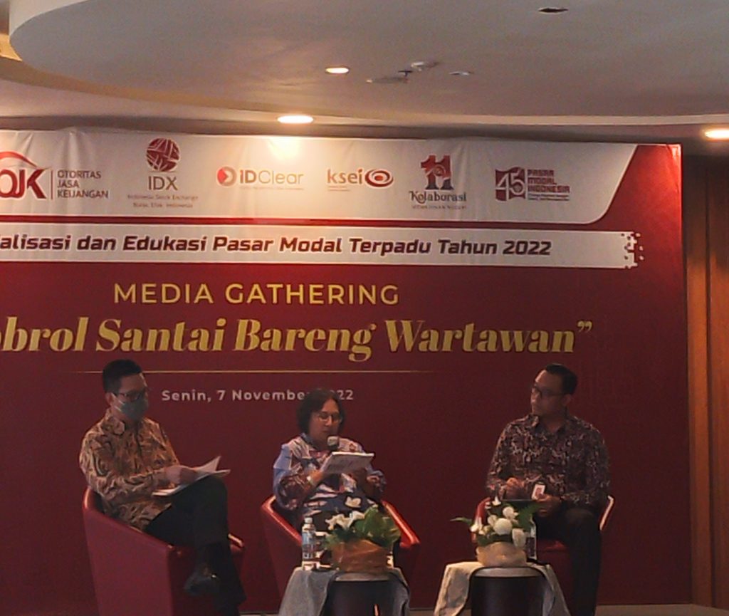 Pada kegitan media gathering bertajuk Bincang Santai dengan Wartawan di Hotel Radisson, Batam, Senin (7/11/2022) tampil dua pembicara yakni; Kepala Departemen Pengawasan Pasar Modal 2B Otoritas Jasa Keuangan (OJK) Ona Retnesti Swaminingrum dan Direktur Pengembangan Bursa Efek Indonesia, Jeffrey Hendrik.