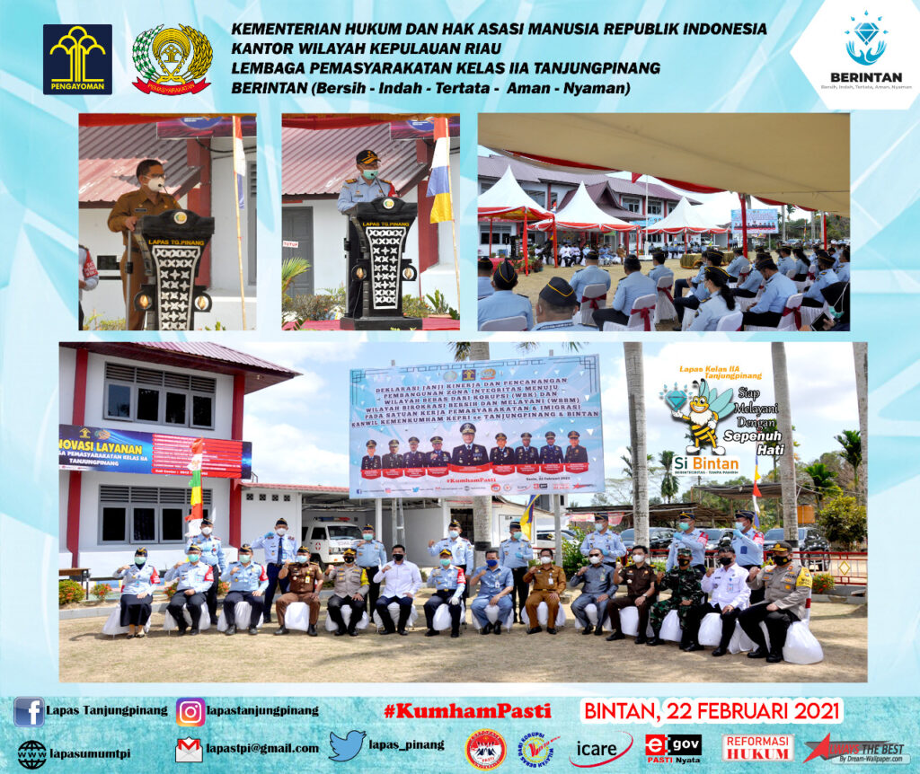 PROBATAM.CO, Bintan– Delapan Unit Pelaksana Teknis (UPT) Pemasyarakatan dan Imigrasi Kantor wilayah Kemenkumham Kepri se Tanjungpinang dan Bintan melaksanakan kegiatan Deklarasi Janji Kinerja dan Penandatanganan Komitmen Bersama Pembangunan Zona Integritas menuju Wilayah Bebas dari Korupsi ( WBK ) dan Wilayah Birokrasi Bersih dan Melayani ( WBBM ) Tahun 2021 di lapangan upacara Lapas Kelas IIA Tanjungpinang, Senin (22/02/2021).
