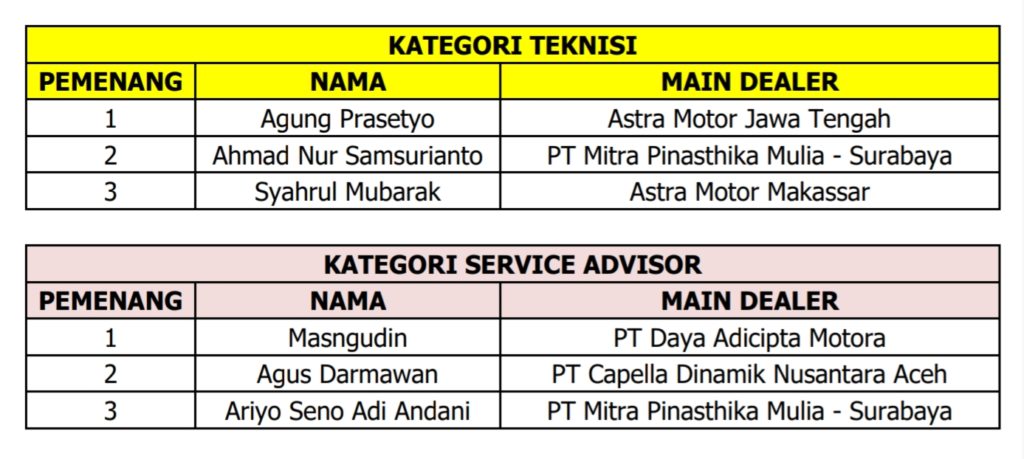 Sementara itu, juara 2 kompetisi ini mendapatkan masing-masing 1 unit New Honda CB150 Verza. Lalu untuk teknisi dan service advisor AHASS yang memperoleh juara 3 mendapatkan New Honda BeAT Sporty.