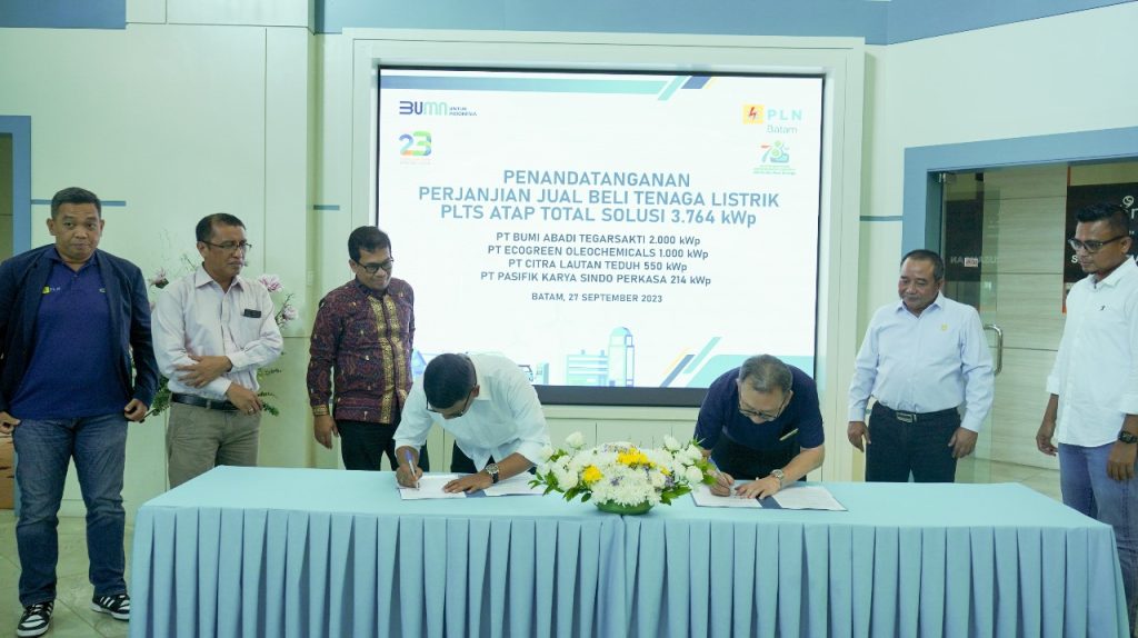 Komitmen terus diwujudkan dan hari ini penandatanganan Perjanjian Jual Beli Tenaga Listrik (PJBTL) antara PT PLN Batam dengan PT Bumi Abadi Tegarsakti, PT Ecogreen Oleochemical, PT Citra Lautan Teduh dan PT Pasifik Karya Sindo Perkasa dalam Penyediaan Pembangkit Listrik Tenaga Surya (PLTS) Photovoltaic (PV) rooftop dengan kapasitas total 3.764 KWp di Kantor Korporat PT PLN Batam.