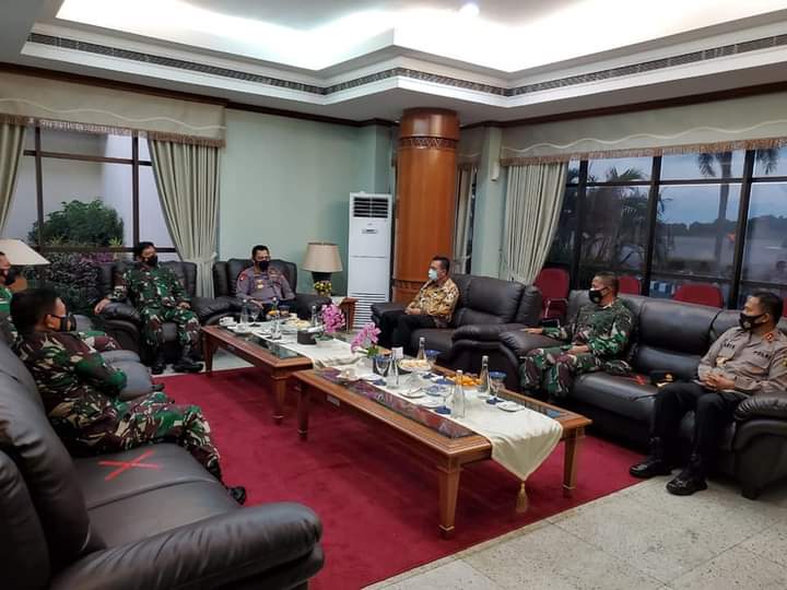 Panglima TNI Marsekal TNI Hadi Tjahjanto dan Kapolri Jenderal Pol Listyo Sigit Prabowo dan Gubernur Kepulauan Riau Ansar Ahmad, serta petinggi TNI Polri Kepri adakan pertemuan khusus dalam rangka koordinasi di Bandara Hang Nadim Batam, Kamis (04/03/2021). (Photo: syn)