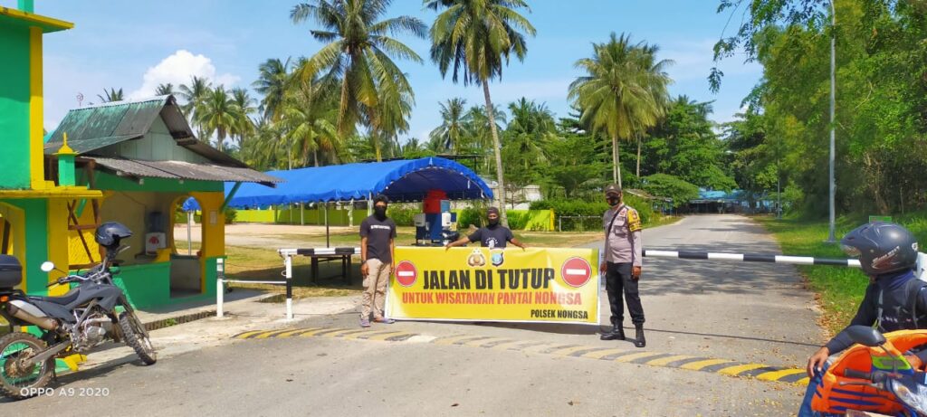 Berkaitan dengan hal itu Polsek Nongsa melaksanakan Pemasangan Spanduk Penutupan Sementara Tempat Wisata Pantai Nongsa.