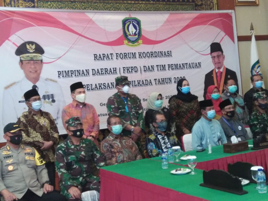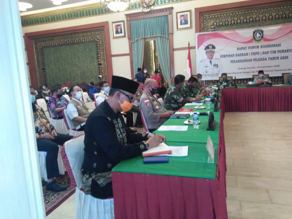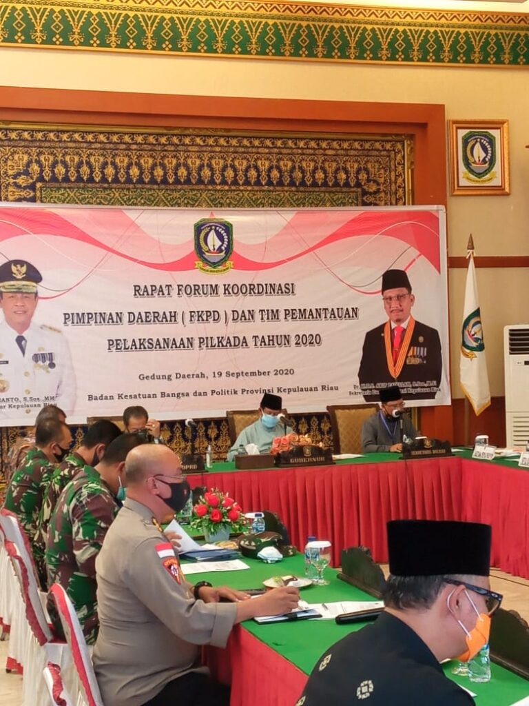 Perwakilan Bupati Se- Provinsi Kepri, Ketua KPU Provinsu Kepri Sriwati, Ketua Bawaslu Provinsi Kepri M. Sjahrie Papene, Kadinkes Provinsi Kepri Tjejep Yudiana serta Gugus Tugas Covid-19 Provinsi Kepri Dr. Hasim As’ari.