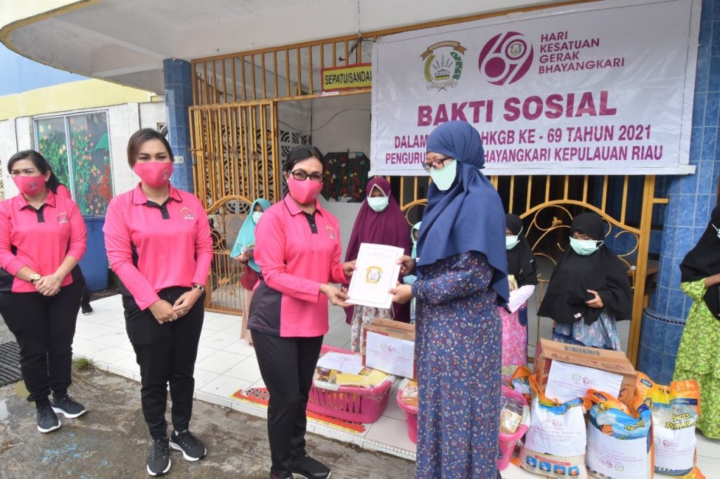 ″Hari ini kita mengadakan Bakti Sosial dalam rangka HKGB ke – 69 tahun 2021, Bakti sosial berupa penyerahan Paket sembako di Panti Asuhan Damai Sejahtera, Batu Aji, Panti Asuhan Al-Hidayah Sei Harapan, Sekupang, Panti Asuhan Daarut Thaybah, Sekupang dan kepada warga di Tanki 1.000, Batu Ampar Kota Batam″, tutur Ketua Bhayangkari Daerah Kepri Ny. Sinche Aris Budiman.