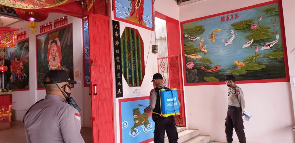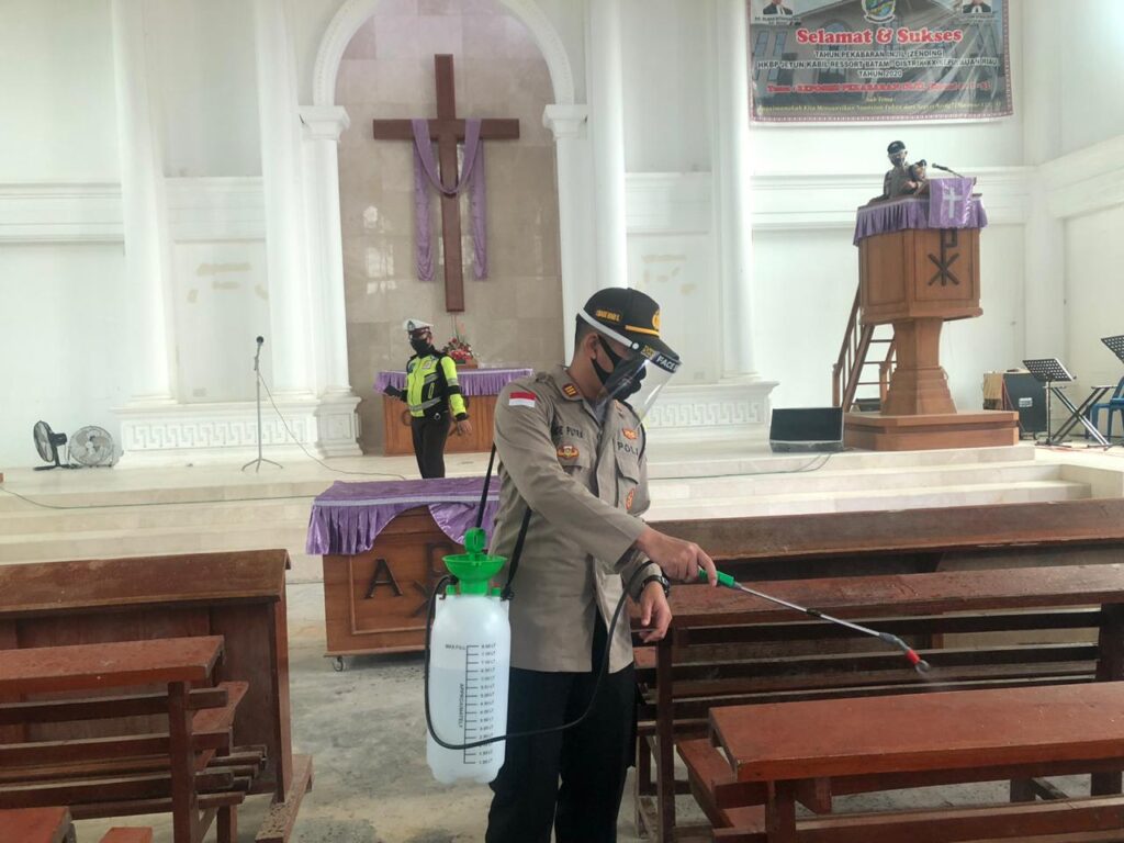melakukan Penyemprotan dari Polsek Nongsa Bergerak menuju Tempat tempat ibadah yang sudah berkordinasi terlebih dahulu dengan pengurus Tempat ibadah tersebut.