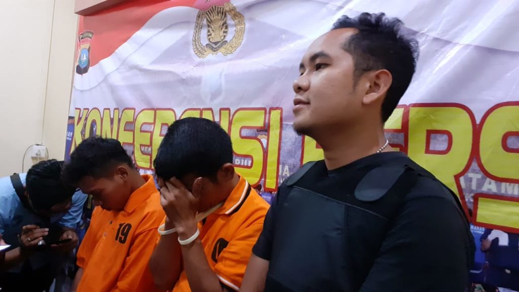Pelaku EM disamping polisi, menutup wajahnya saat diwawancarai wartawan. photo: probatam/per