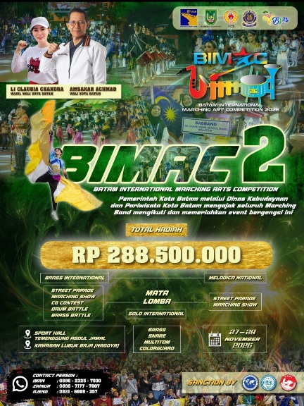 PROBATAM.CO, Batam – Pemerintah Kota Batam melalui Dinas Kebudayaan dan Pariwisata (Disbudpar) kembali menghadirkan event bergengsi bertaraf internasional, Batam International Marching Arts Competition (BIMAC) 2, yang akan digelar pada 27–29 November 2026 di Sport Hall Temenggung Abdul Jamal dan kawasan Lubuk Baja (Nagoya), Batam.