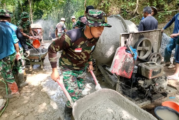 Tak ada jarak antara loreng dan pakaian kerja warga. Mereka membaur, saling mengoper ember, meratakan adukan, dan memastikan setiap sudut terisi sempurna. Peluh menetes, namun senyum tak pernah luntur.