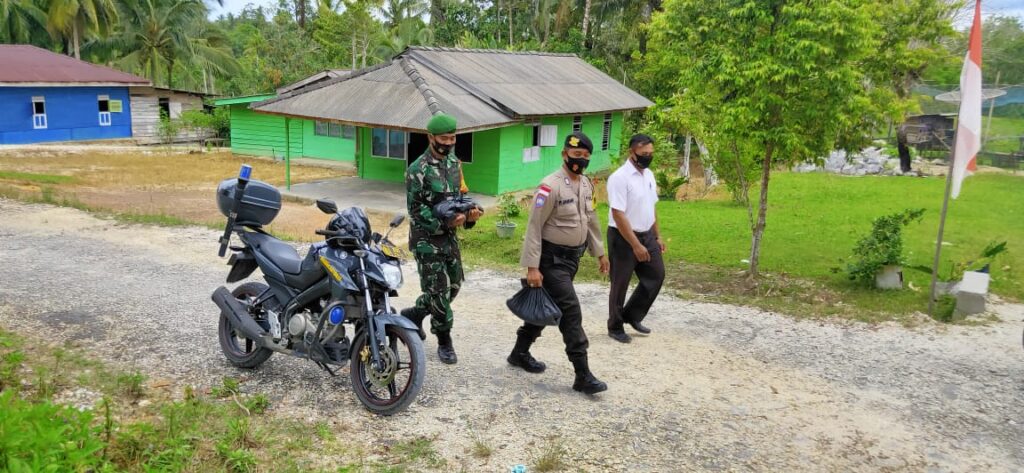 Bhabinkamtibmas dan Babinsa kompak bagikan bantukan kepada masyarakat di desa Tapau. (Photo:dok/polsek)