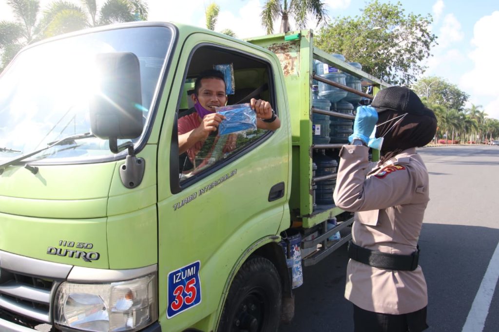 Polwan yang juga anggota Bhayangkari Cabang Kota Barelang, Daerah Kepri memberikan masker kepada sopir dan pengendara jalan raya di Kota Batam, Selasa (21/4/2020). (photo:probatam/iin)
