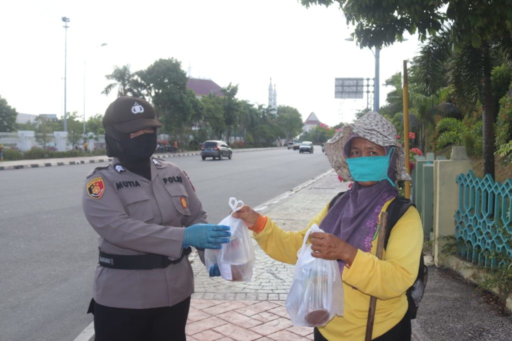 Polwan yang juga anggota Bhayangkari Cabang Kota Barelang, Daerah Kepri memberikan makanan kepada masyarakat di Kota Batam, Selasa (21/4/2020). (photo:probatam/iin)