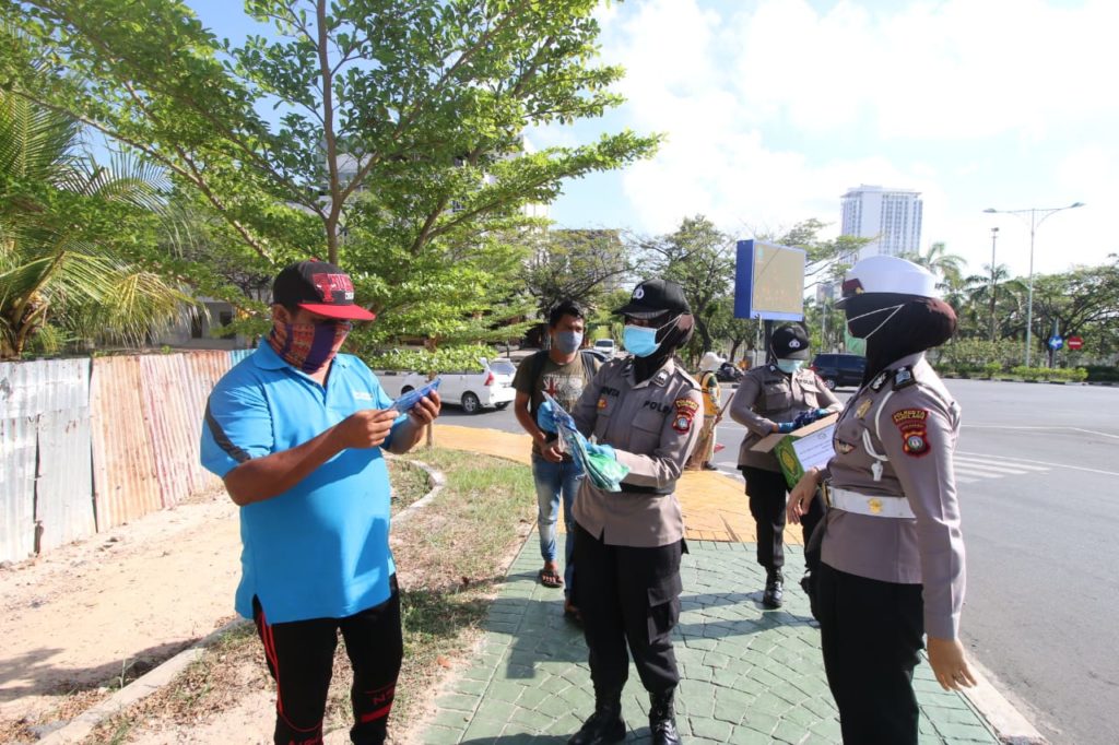 Polwan yang juga anggota Bhayangkari Cabang Kota Barelang, Daerah Kepri memberikan ribuan masker kepada masyarakat di Kota Batam, Selasa (21/4/2020). (photo:probatam/iin)