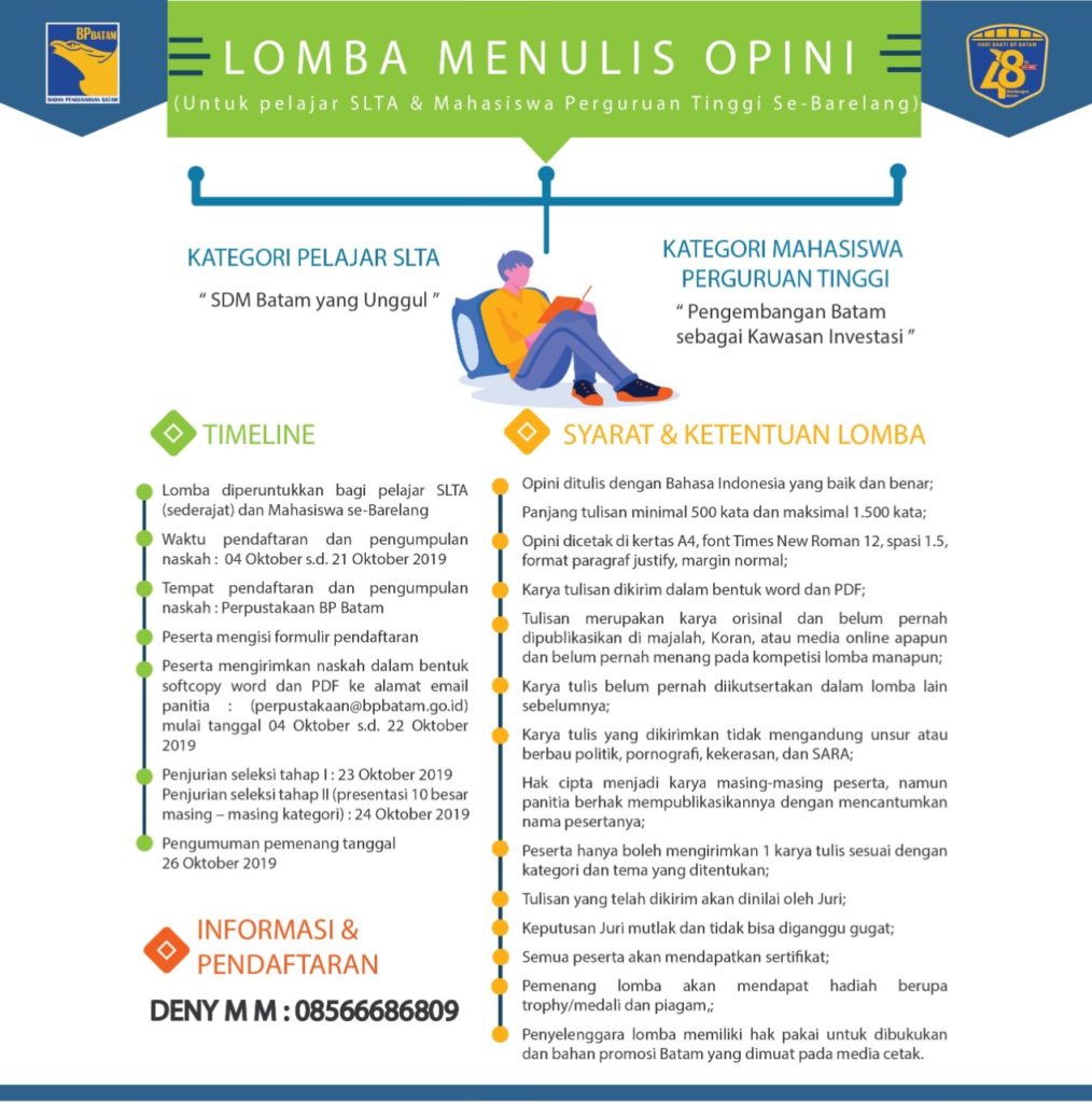PROBATAM.CO, Batam – Badan Pengusahaan (BP) Batam menggelar Lomba Menulis Opini untuk kategori palajar SLTA sederajat dan, mahasiswa perguruan tinggi se-Barelang. Mengambil tema “SDM Batam yang Unggul” dan “Pengembangan Batam sebagai Kawasan Investasi”, lomba ini bagian dari rangkaian dalam menyambut Hari Bakti BP Batam ke-48 tahun pada 26 Oktober mendatang.