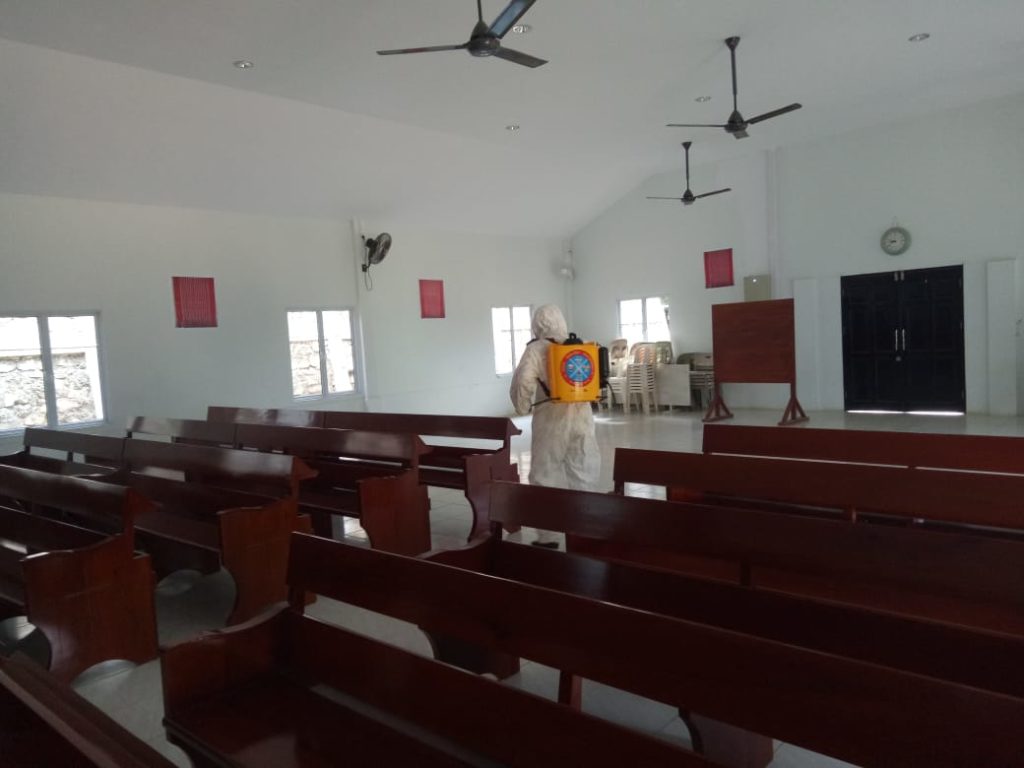 Selesai penyemprotan cairan di lokasi Kepri Mall tersebut selanjutnya tim Subden Kimia Biologi dan Radio Aktif Brimob Polda Kepri menuju ke Gereja GBKB Bida Asri Batam Kota. Di tempat ibadah tersebut, tim mulai melakukan penyemprotan pada Mimbar, kursi, meja, lantai sampai dengan Handle Pintu Gereja tidak luput dari penyemprotan cairan Disinfektan.