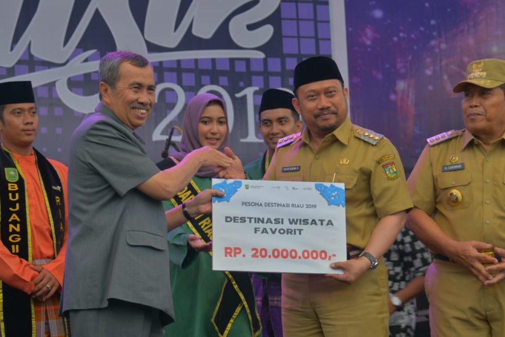 PROBATAM.CO, Pekanbaru – Raut wajah Bupati Kampar Catur Sugeng Susanto tampak sumringa, senyumnya memancarkan aura kebahagiaan yang tiada terkira ketika Gubernur Riau, Syamsuar menyerahkan piagam penghargaan atas penetapan kawasan Suaka Margasatwa Bukit Rimbang Baling, Kampar Kiri Hulu sebagai destinasi wisata favorit pada Anugerah Pesona Destinasi (APD) Riau ke 2 tahun 2019 yang berlangsung di areal Purna MTQ Pekanbaru, Senin (2/12/2019).