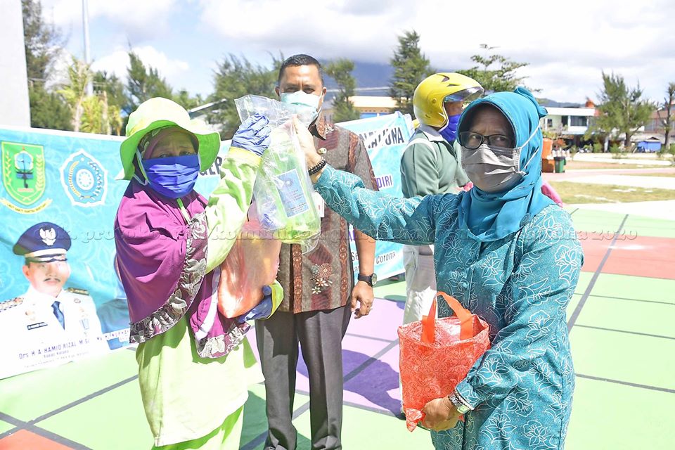PROBATAM.CO, Natuna – Bupati Natuna, H. Abdul Hamid Rizal menyerahkan bantuan kepedulian pencegahan Virus Corona (Covid-19) kepada pelaku usaha jasa transportasi roda dua (tukang ojek) dan petugas lapangan harian pertamanan, di Panggung Geopark Natuna Pantai Piwang Ranai, Kamis (9/4/2020)