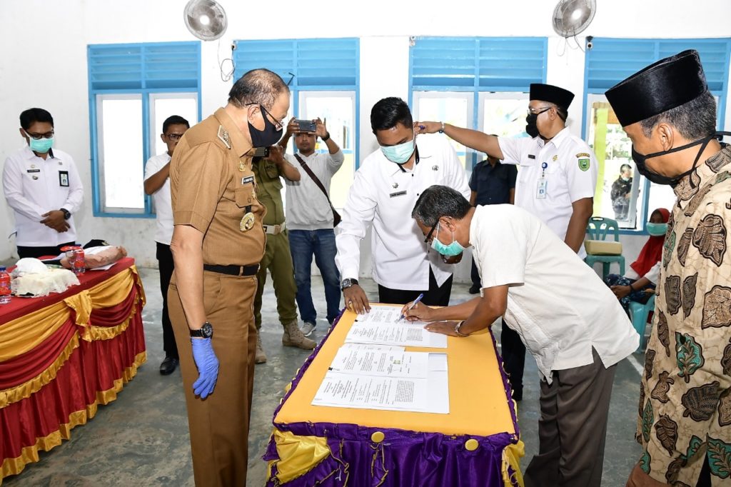 Bupati Natuna Abdul Hamid Rizal menyaksikan penerima menandatangi beriita acara penerimaan bantuan. (Photo:def/protokol)