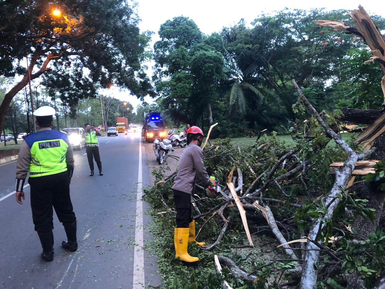 Personil Polresta Barelang Lakukan Kegiatan SAR Terbatas Evakuasi Pohon Tumbang di Sukajadi