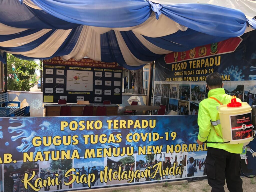 Personel Sat Samapta Polres Natuna menyemprotkan disinfektan ke posko terpadu Covid-19. (Photo:hms)