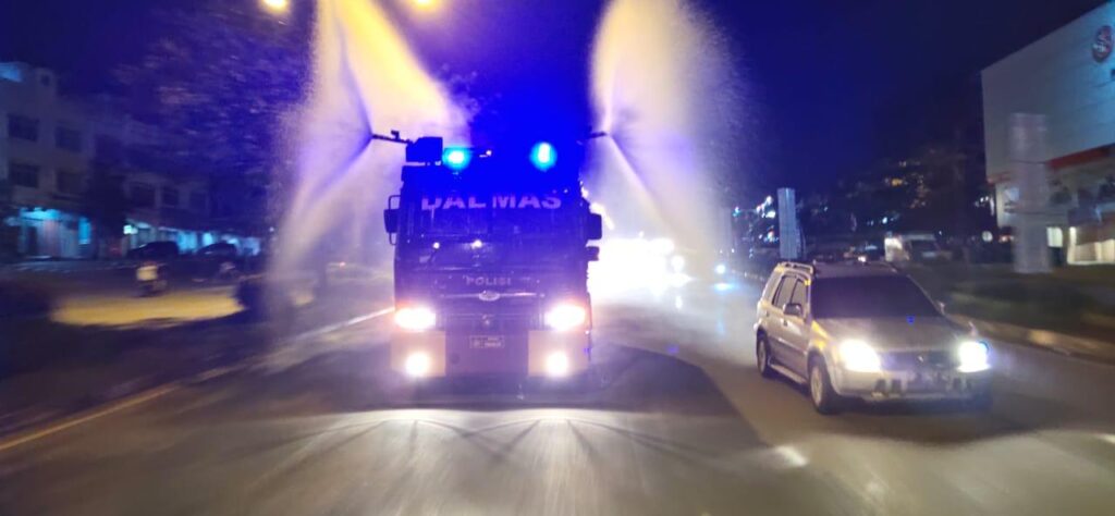 PROBATAM.CO, Batam – Personil Satuang Sabhara Polresta Barelang kembali melakukan penyemprotan disinfektan di jalan-jalan protokol Kota Batam khususnya Simpang jam (FLY OVER) dan Batam Center sehubungan dengan maraknya wabah penyakit (COVID-19).