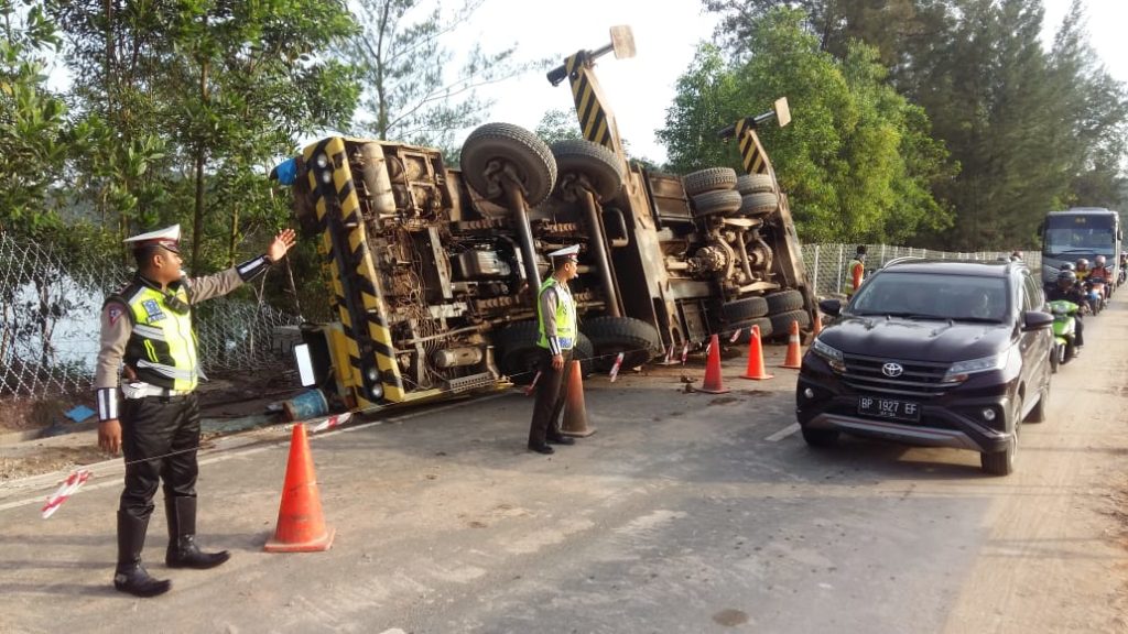 PROBATAM.CO, Batam – Kecelakaan kerja terjadi di kawasan proyek Dam Sei ladi, Senin (23/12). Sebuah alat berat jenis crane terbalik dan menutupi separuh jalan.