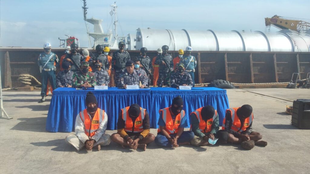 ” Jadi saat melintas di perairan Karang Banteng, kapal tersebut didatangi oleh dua speed boat yang dalamnya terdapat lima orang pelaku pencurian kapal di laut. Pada saat yang sama KRI Siwar-646 melaksanakan kegiatan patroli keamanan laut di kawasan tersebut dan memantau aktivitas upaya pencurian yang dilakukan oleh lima orang,” ujar