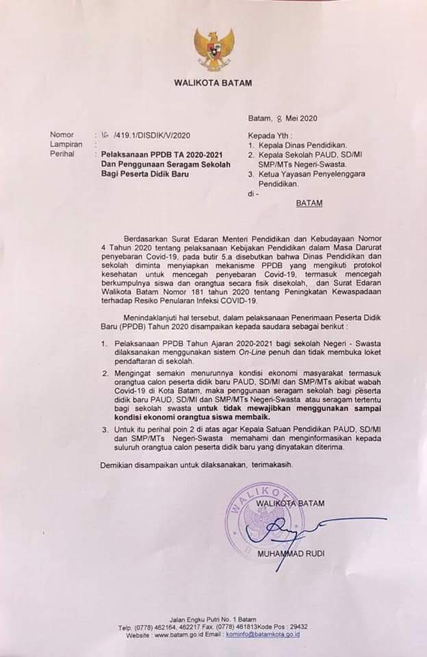 PROBATAM.CO, Batam- Pemerintah Kota (Pemko) Batam mengeluarkan surat edaran terkait pelaksanaan penerimaan peserta didik baru (PPDB) tahun 2020 dan penggunaan seragam bagi peserta didik baru. Surat dengan nomor 16/419.1/DISDIK/V/2020 tersebut ditandatangani langsung oleh Wali Kota Batam, Muhammad Rudi.
