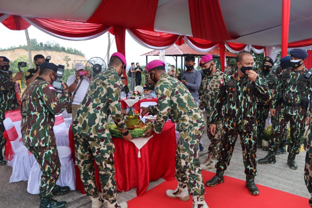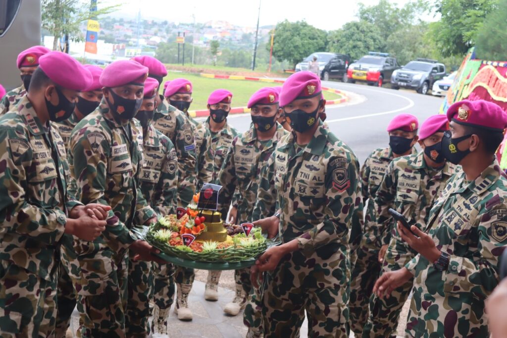 Prajurit Marinir 10/SBY memotong tumpeng sambil menyanyikan lagu selamat ulang tahun, untuk disuapkan ke Dansat Brimob Polda Kepri Kombes Pol. Rendra Salipu, Sabtu (14/11/2020). (Photo:dok/danyonif)