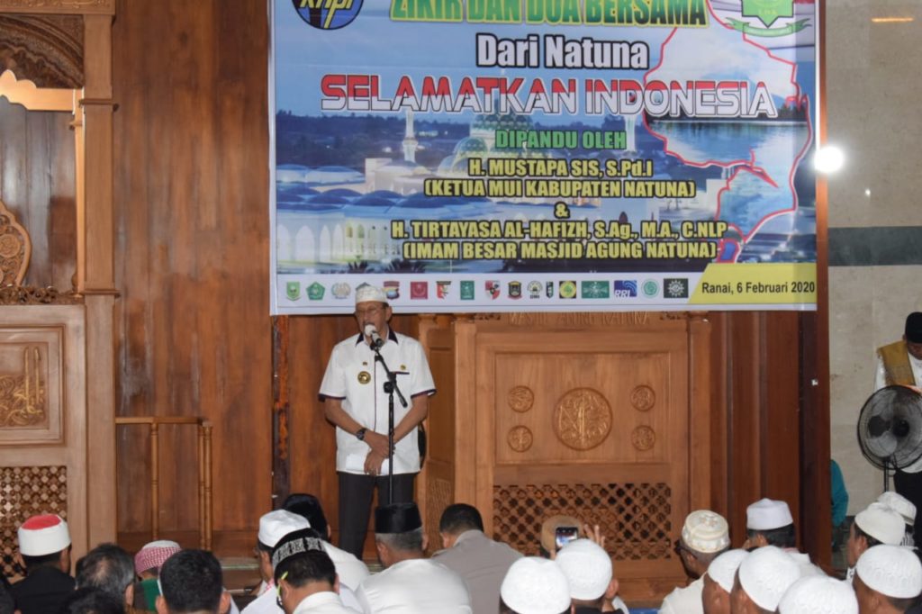 Bupati Natuna Abdul Hamid Rizal dalam sambutannya menyampaikan Dzikir dan Doa Istighotsah Bersama yang bersama dilaksanakan ini bertujuan untuk memohon kepada Allah SWT agar diberikan keselamatan seluruh masyarakat yang berada di Natuna maupun Warga Negara Indonesia (WNII dari Wuhan yang saat ini jalani Observasi (Karantina) di Natuna.