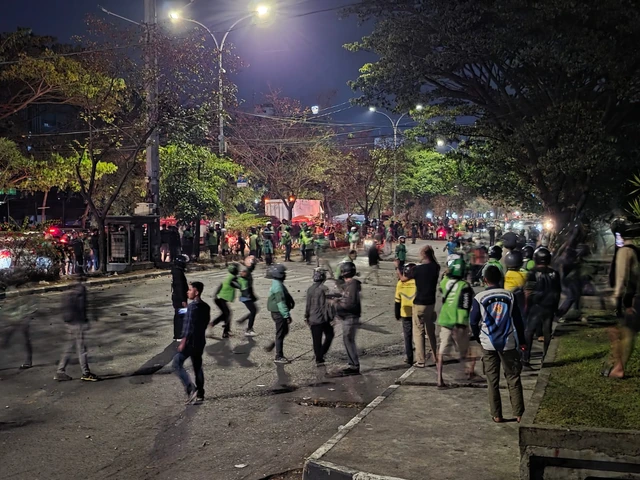 Lalu lintas di lokasi juga tampak lumpuh total dan tidak dapat dilalui kendaraan. Massa berjaket ojol juga masih bertahan di sekitar kampus.