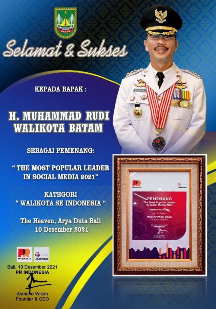 PROBATAM.CO, Batam – Wali Kota Batam Muhammad Rudi kembali mendapat penghargaan, kali ini dari Majalah PR Indonesia. Rudi dinobatkan sebagai Most Popular Leader in Social MediaSub Kategori Wali Kota. Penghargaan ini diberikan pada Forum Jambore PR INDONESIA (JAMPIRO) #7 di Provinsi Bali, Jumat (10/12/2021).