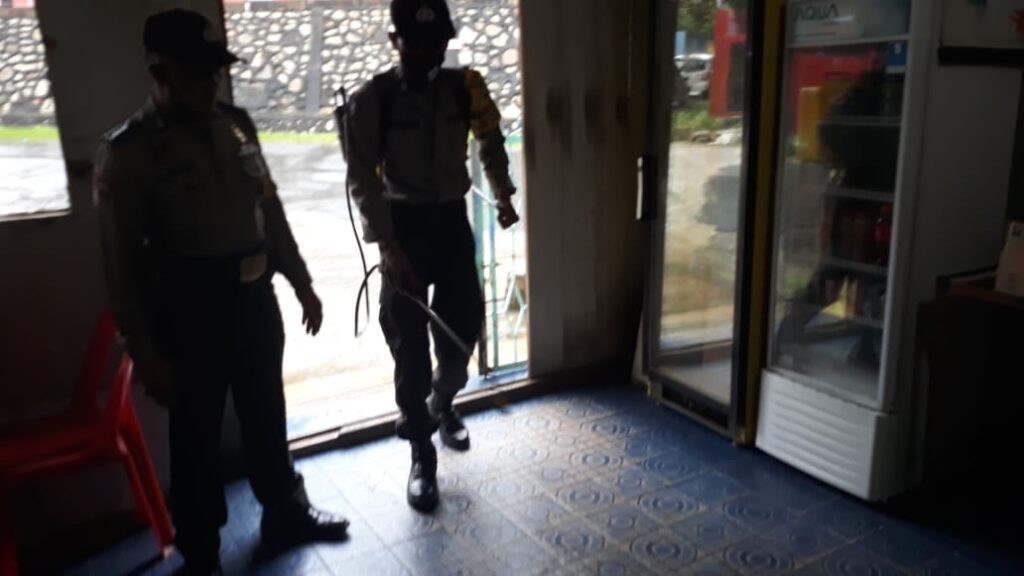 PROBATAM.CO, Batam- Polsek Batu Ampar melalui Unit Binmas Polsek setempat melakukan penyemprotan cairan disinfektan di warung pojok di Komplek Sumber Agung, Kelurahan Sei. Jodoh, Kecamatan Batuampar, Kota Batam, Rabu (29/7/2020).