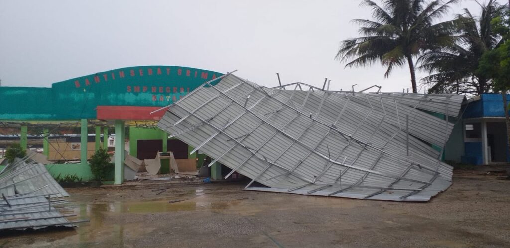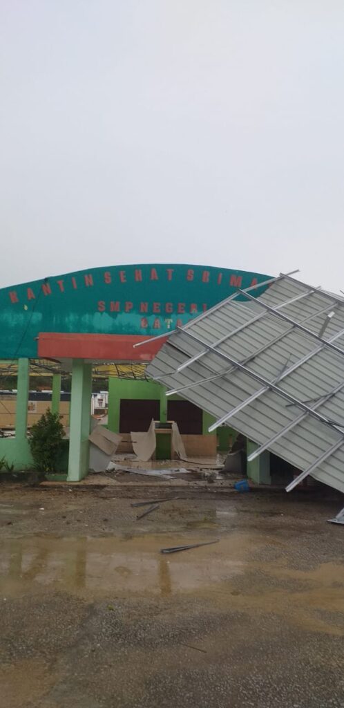Katin SMPN 20 Batam yang berada di kawasan Tiban Koperasi, Kelurahan Tiban Baru, Kecamatan Sekupang, merusak pelafon hingga atap roboh.