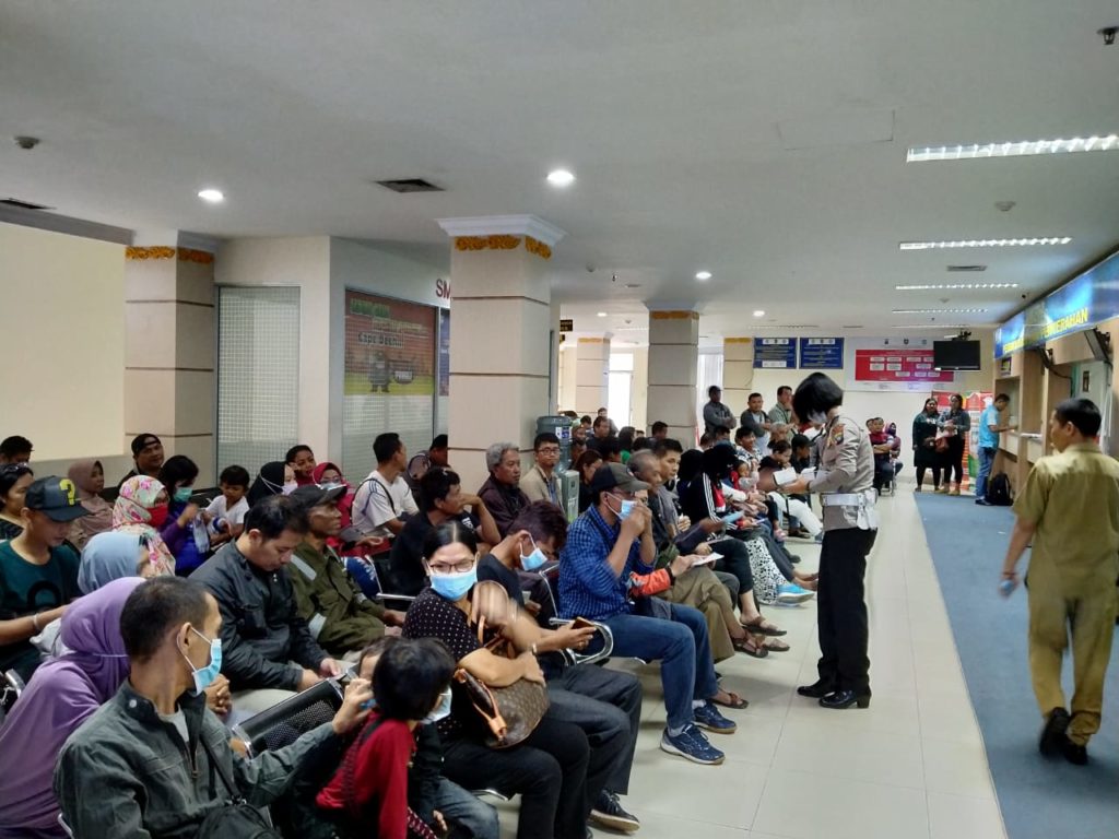 PROBATAM.CO, Batam – Direktorat Lalu Lintas Polda Kepri bagikan masker ke para pengunjung Samsat di gedung Graha Kepri, Batam Center, Kota Batam, Provinsi Kepulauan Riau (Kepri), Senin (3/2/2020).