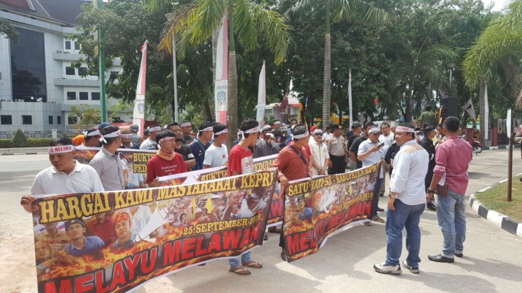 PROBATAM.CO, Batam – Puluhan masyarakat Melayu yang tergabung dalam gerakan Melayu Melawan melakukan aksi unjuk rasa di depan Gedung Graha Kepri, Batam Center, Rabu (25/9).