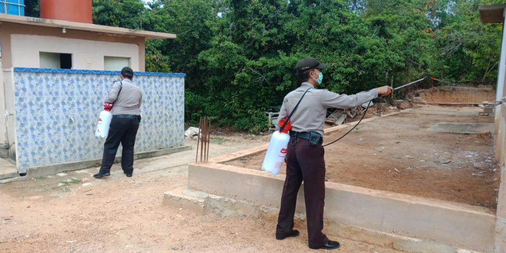 Personil Polsek Moro melakukan penyiraman dan penyemprotan disinfektan di rumah ibadah, Minggu (5/4/2020). (photo:probatam/iin)