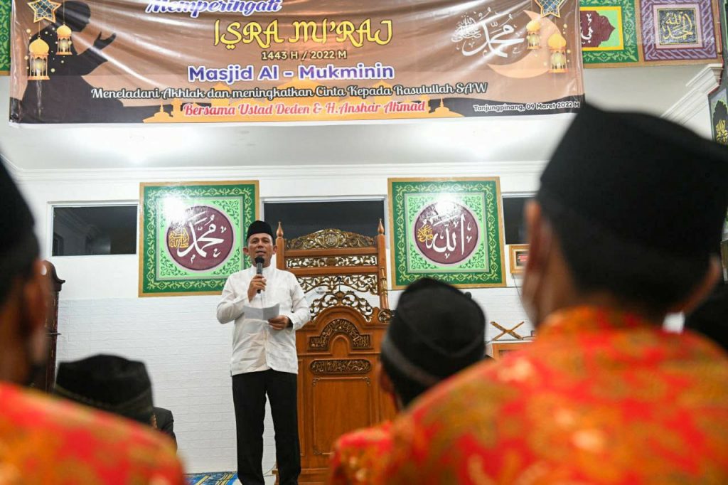 PROBATAM.CO, Tanjungpinang – Gubernur Kepulauan Riau H. Ansar Ahmad menghadiri Peringatan Isra Miraj Nabi Muhammad SAW 1443 H disejalankan dengan Penyerahan Bantuan Dana Hibah kepada Masjid Al Mukminin dan TPQ Al Ikhlas di Masjid Al Mukminin, Tanjungpinang, Rabu (9/3) malam. Acara diisi oleh tausiah oleh Ustad Deni Mulyana dengan tema “Meneladani Akhlak dan Meningkatkan Cinta Kepada Rasulullah”